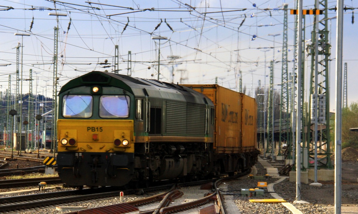 Die Class 66 PB15 von Railtraxx BVBA fährt mit viel Dieselpower mit einem P&O Ferrymasters Containerzug aus Gallarate(I) nach Zeebrugge(B) bei der Ausfahrt von Aachen-West und fährt in Richtung Montzen/Belgien bei Sonne und Regenwolken am 23.3.2014.