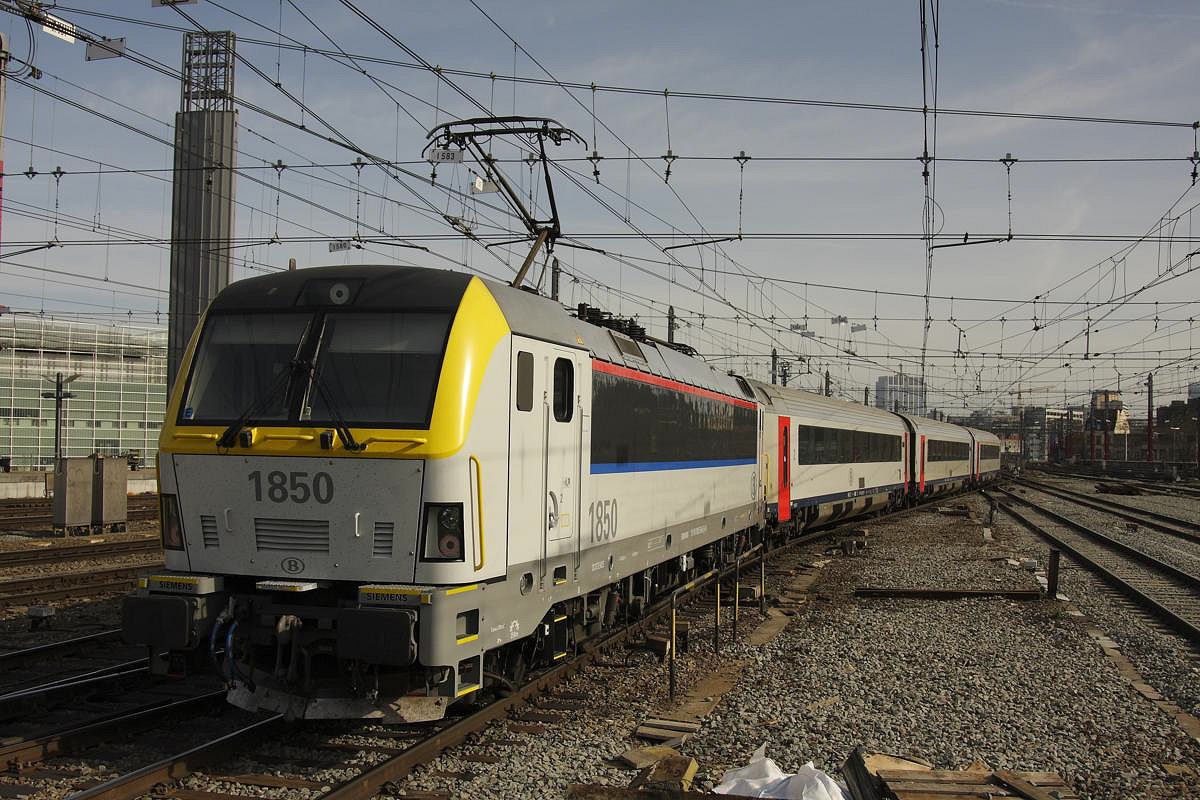 Die Siemens 1850 der SNCB schiebt am 19.03.2014 einen Intercity nach Eupen aus dem Bahnhof Brüssel Midi.