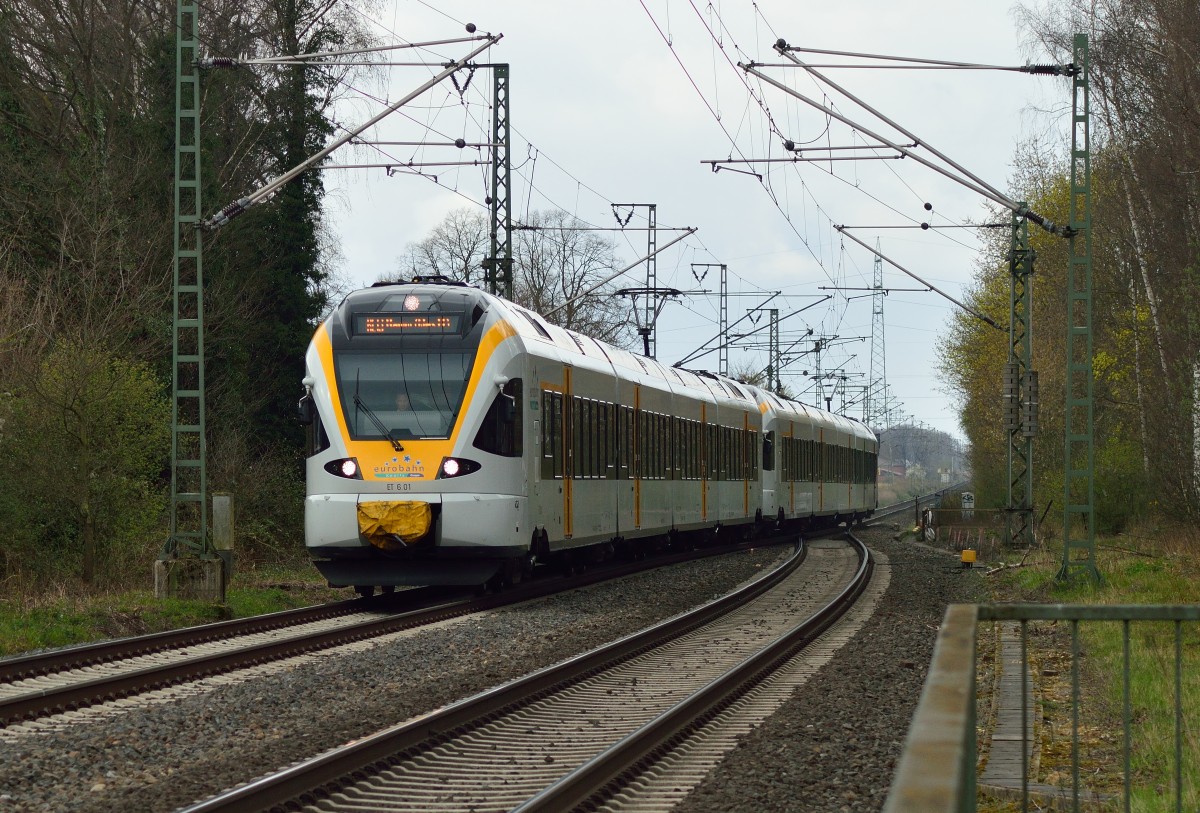 Ein RE 13 Zug auf der Y-Weiche im Bahnhof Dülken, der vom Eurobahntriebwagen ET 6.01 geführte Zug wird gleich den Bahnsteig Gleis 1 erreichen. 23.3.2014