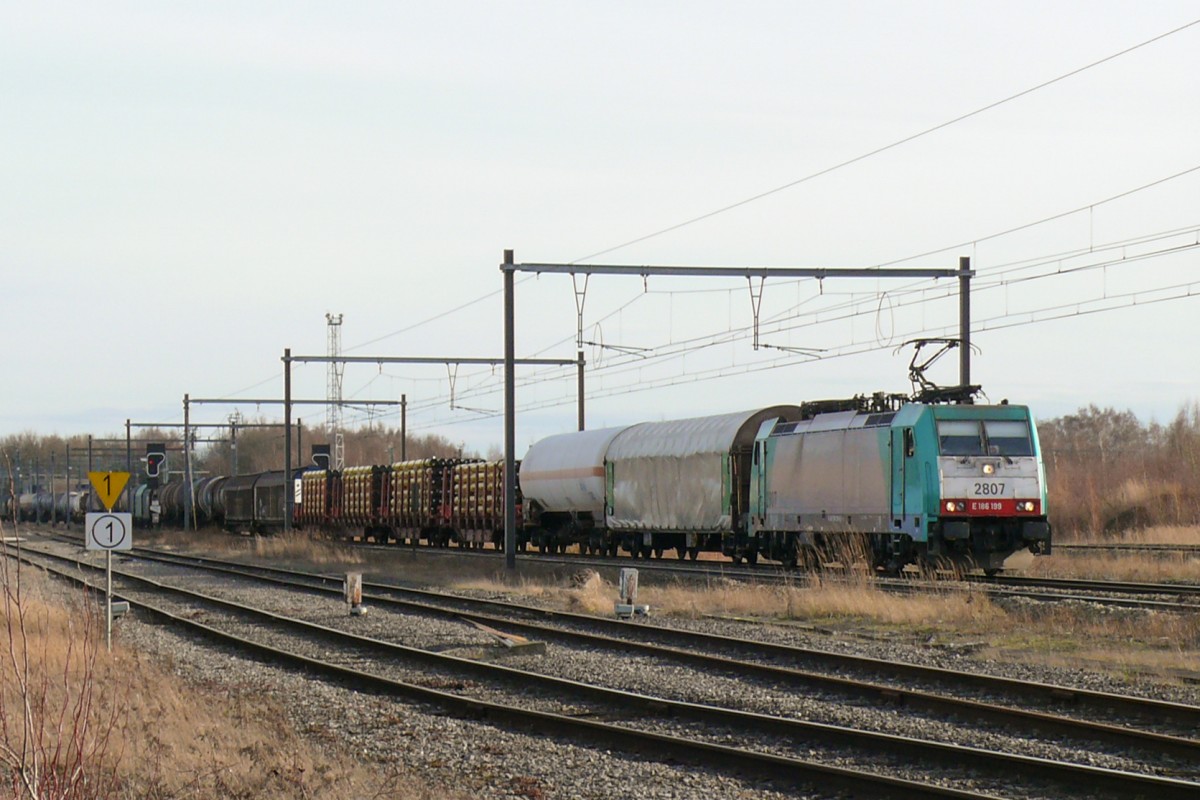 Mein erstes Bild seit meinem Unfall vom September 2011. HLE 2807 zieht einen gemischten Güterzug durch den Bahnhof Montzen in Richtung Antwerpen. Die Aufnahme ist vom 18/01/2014.
