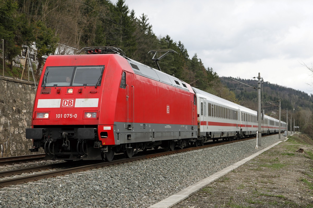 Nach dem Schneetreiben auf der Strecke Rosenheim-Salzburg ist mir bei Sonnenschein in Freilassing die 189 822-0 der Steiermarkbahn begegnet. Hier aus dem IC 865 Bregenz-Wien West am 24.3.2014 fotografiert. Am Haken die BR 189 einen Schotterzug.