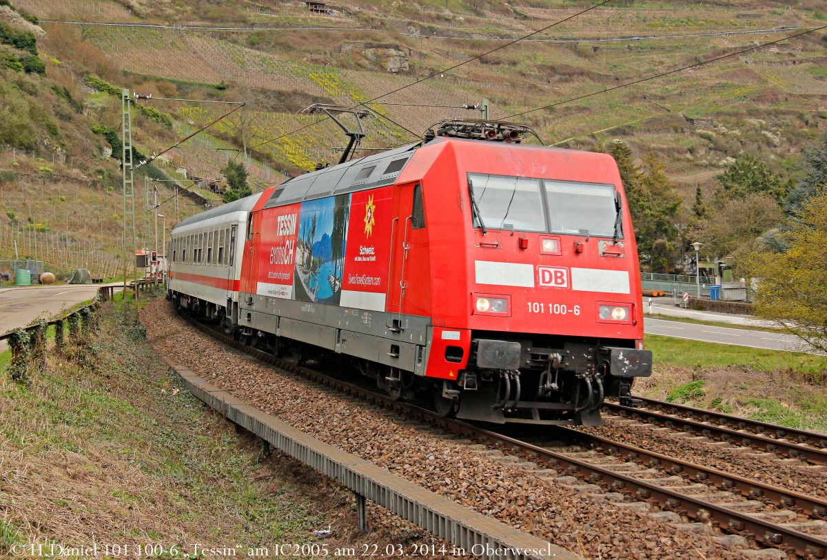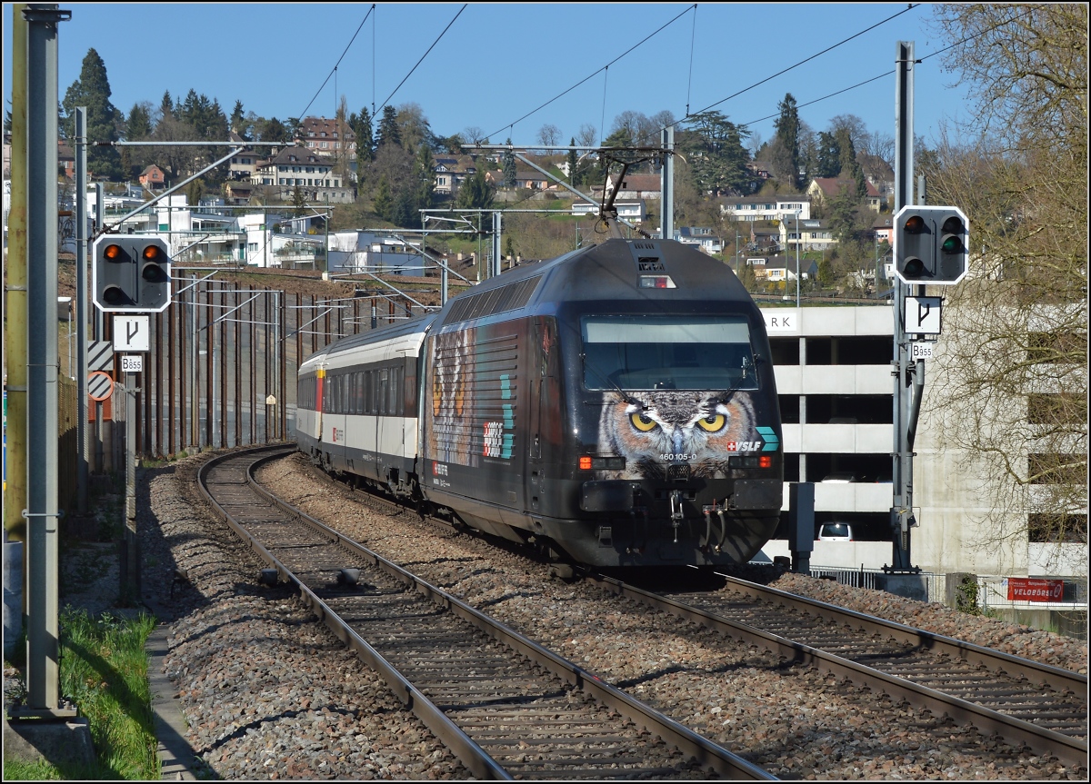 Die wohl bisher beeindruckendste Werbelok hat mich verfolgt, immer die Augen gegen das Auge des Fotografen gerichtet. 460 105-0 im Bahntal zwischen Neuhausen am Rheinfall und Schaffhausen. März 2014.