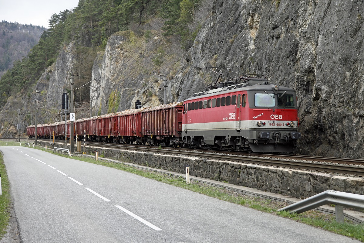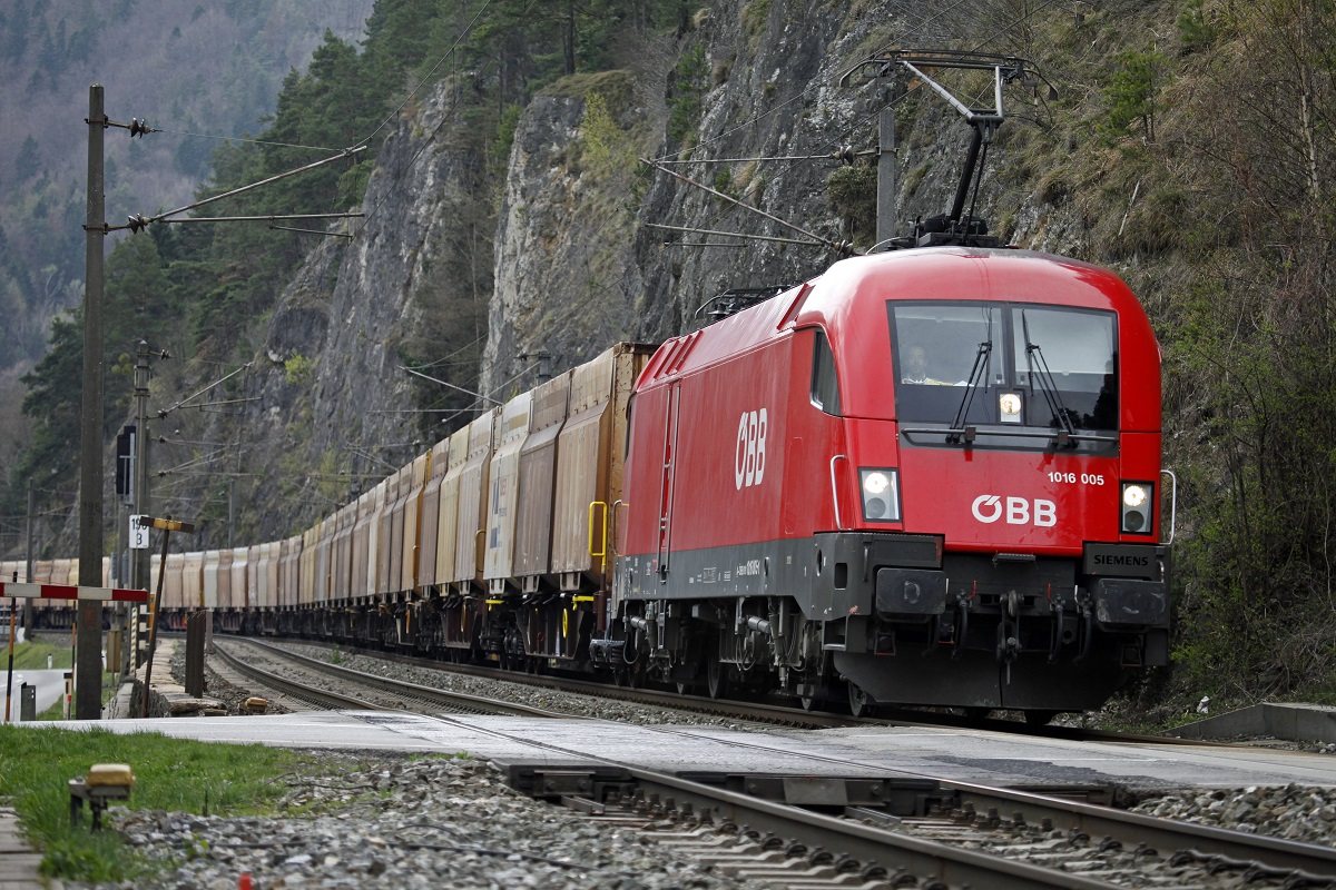 1116 002-7 durchfährt mit einem leeren Schrottzug am 25.3.2014 den Bahnhof Kirchstetten Richtung Wien nach Ungarn.