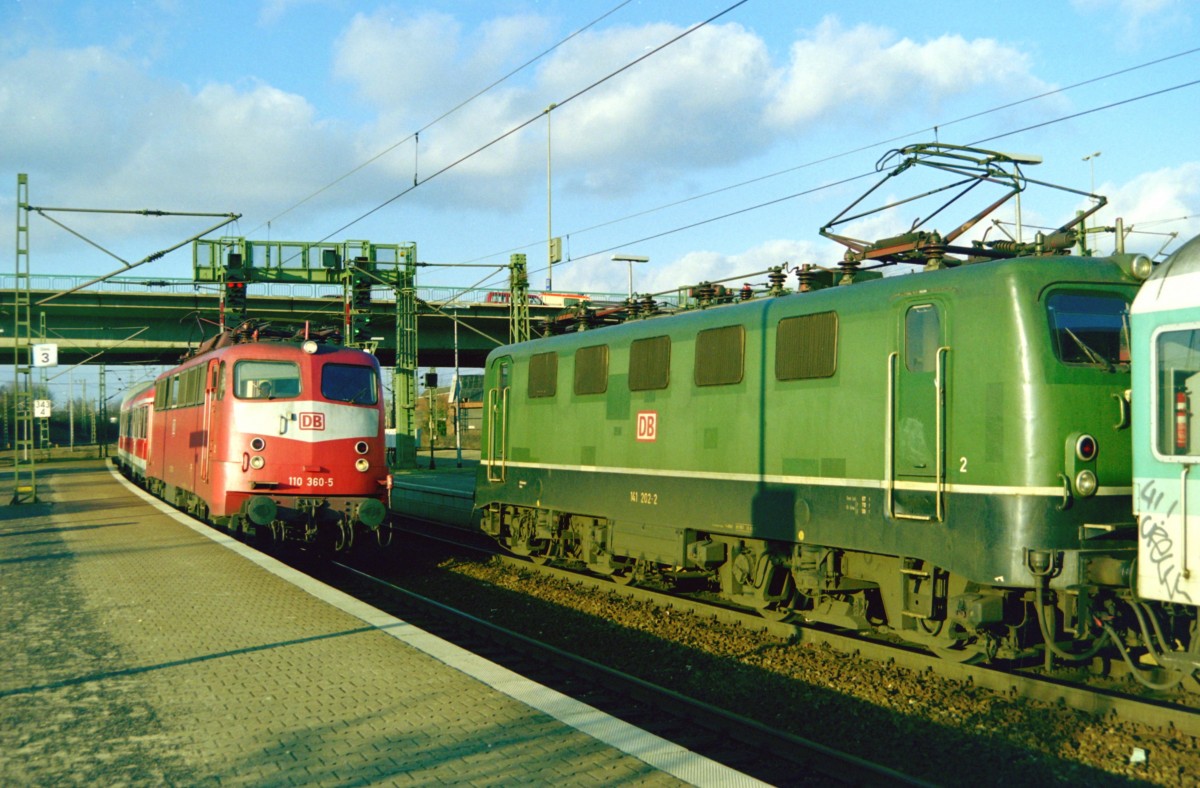 110 360 mit RE 3330 (Hamburg–Bremen) und 141 202 mit SE 5347 (Tostedt–Hamburg) am 24.02.1999 in Hamburg-Harburg