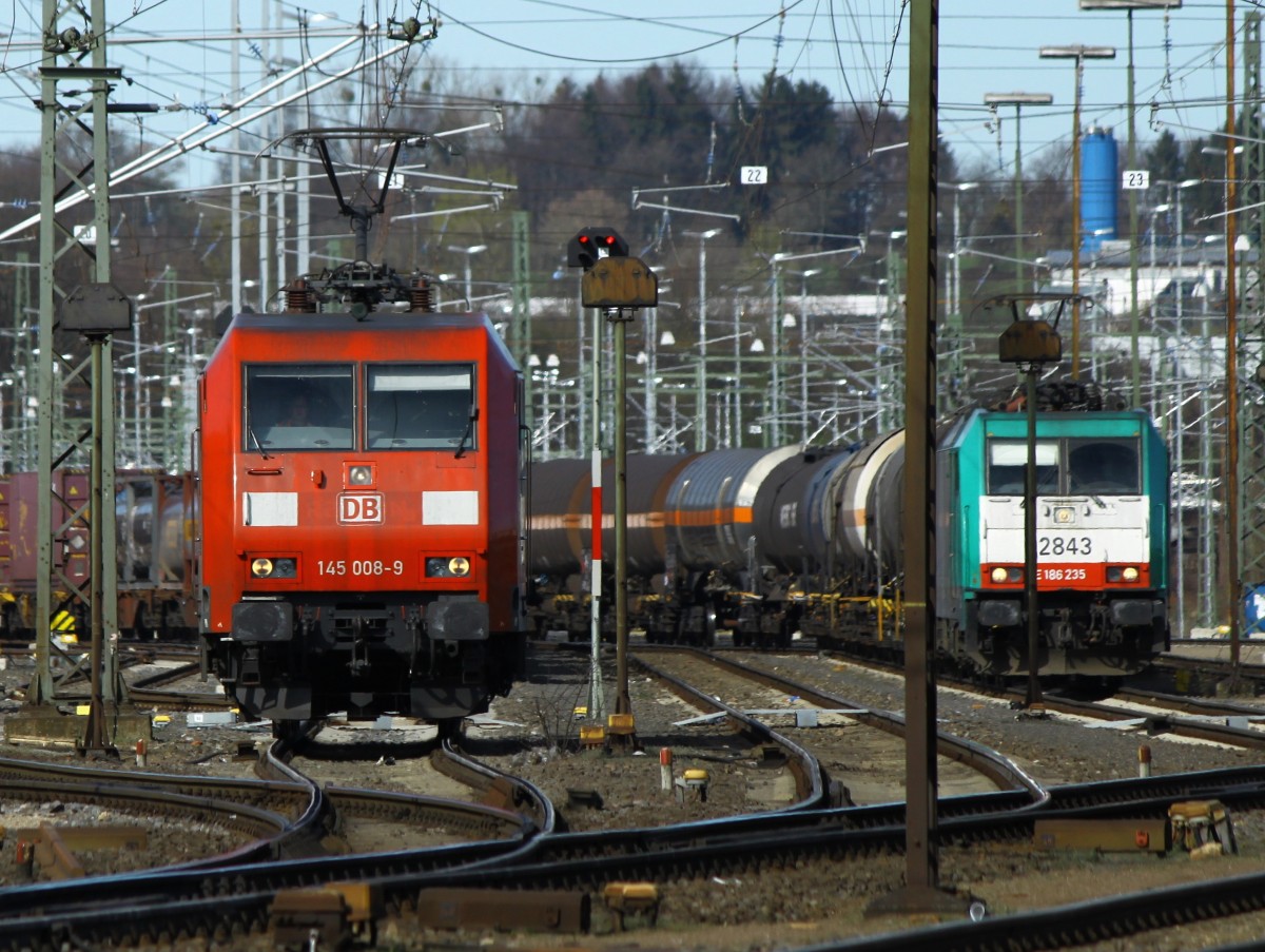 145 008-9 rangiert am 20.03.2014 in Aachen West, rechts im Hintergrund wartet Cobra 186 235 (2843) mit einem Kesselzug am Haken auf Streckenfreigabe nach Belgien.