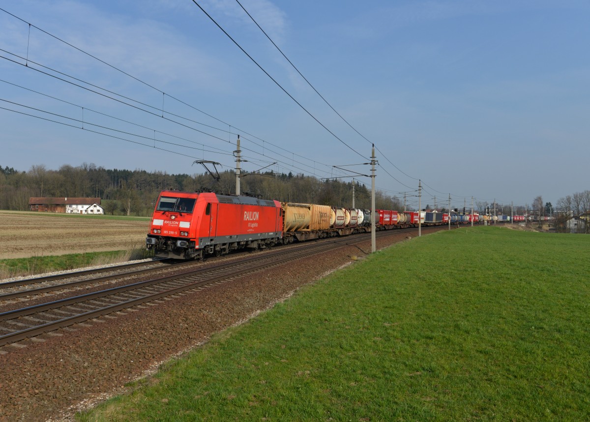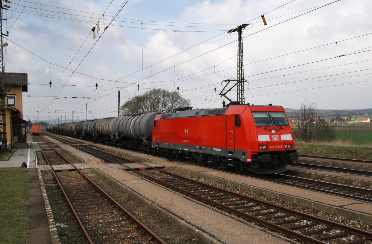 185 234-2 ist am 25.3.2014 mit einem Kesselzug, beladen mit Dieselkraftstoff(30/1202), durch Kirchstetten Richtung Wien unterwegs.
