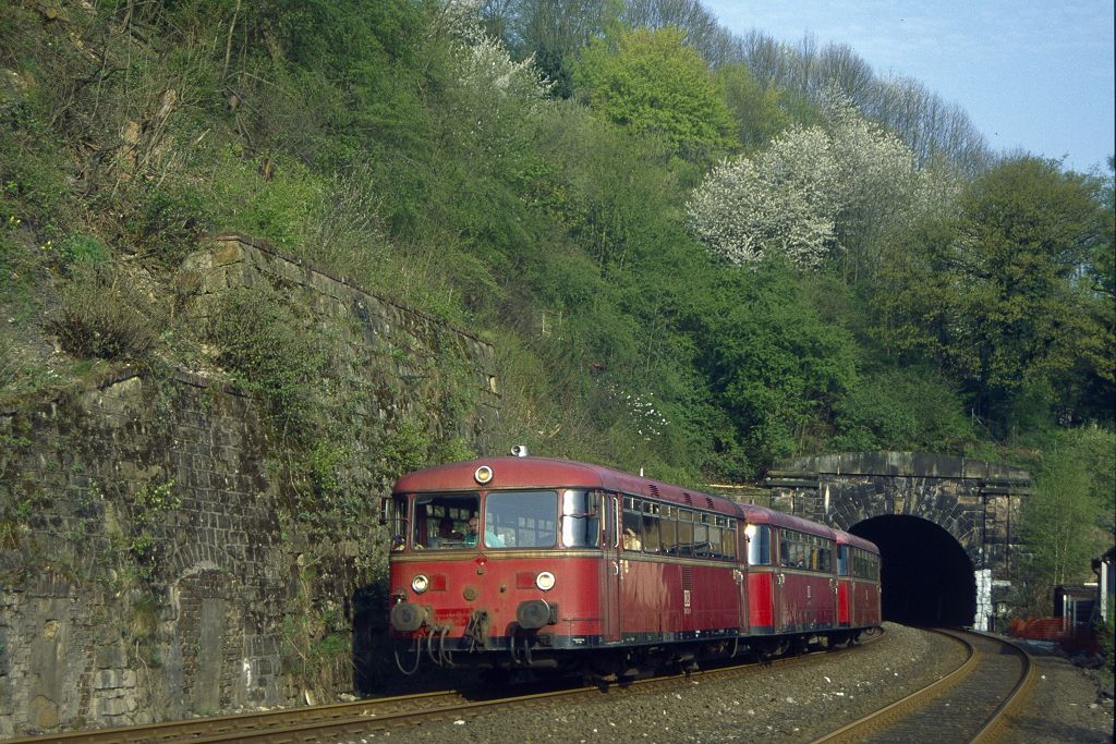 Am 30.04.1995 verlässt 796 702 als Sonderfahrt den Goldbergtunnel bei Hagen-Oberhagen.