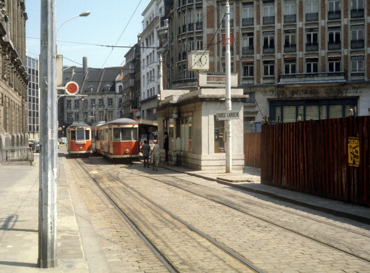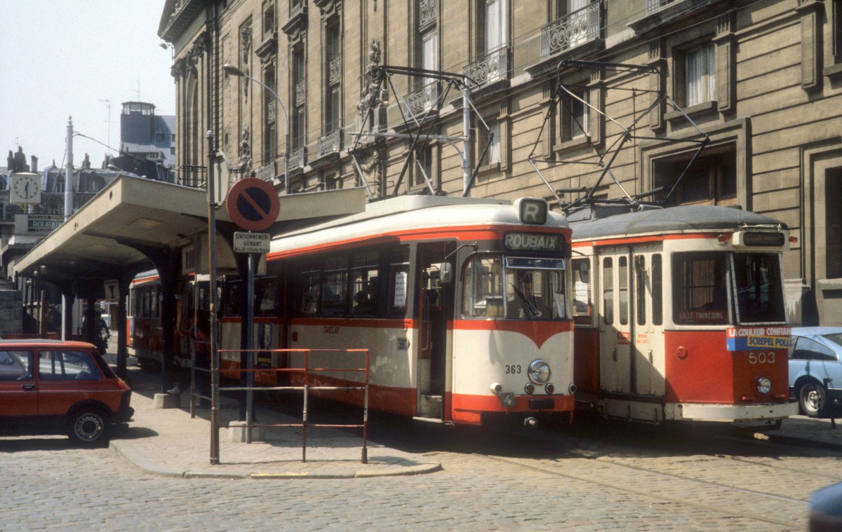 An der Endstelle in Lille Stadmitte halten im Juni 1982 SNERLT / COTRALI SL R (DÜWAG/KIEPE-Tw 363) nach Roubaix und SL T (Tw 503) nach Tourcoing. - La Société Nouvelle de l'Électrique Lille-Roubaix-Tourcoing (SNERLT) übernahm im September 1980 sechs DÜWAG/KIEPE-Grossraumtriebwagen (352, 353, 362, 363, 365 und 367) von den Vestischen Strassenbahnen. Die Wagen wurden im Februar 1981 in Betrieb genommen.