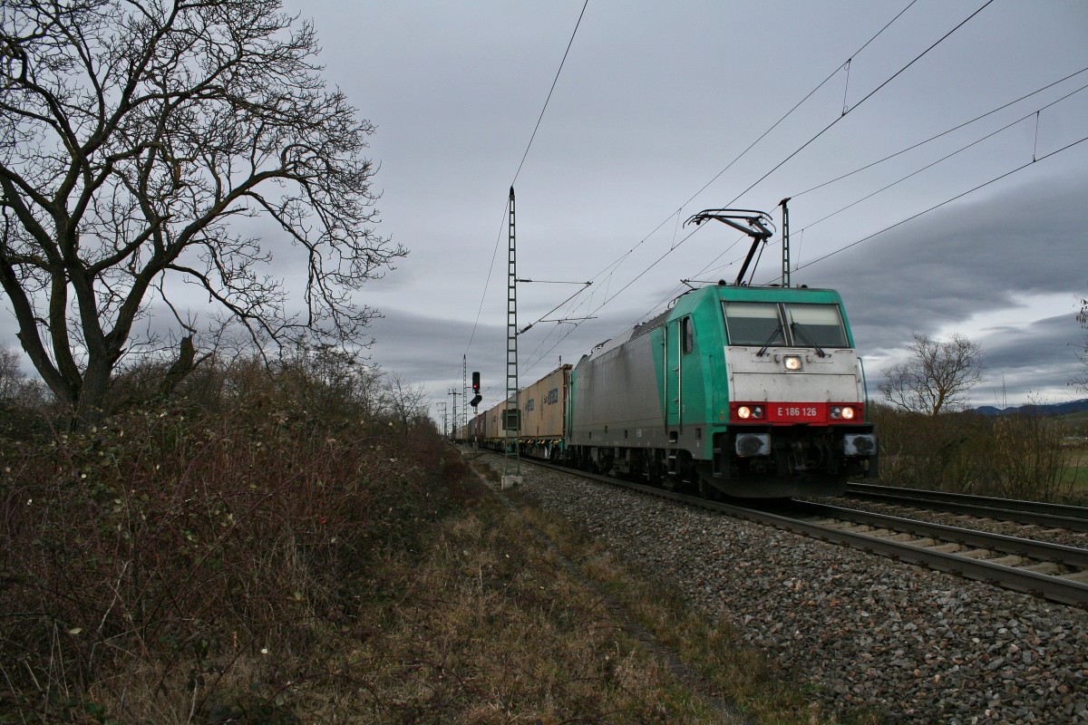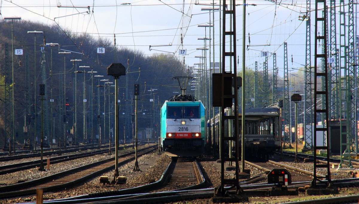 Die Cobra 2816 fährt mit einem langen Containerzug aus Verona(I) nach Antwerpen-Noord(B) bei der Ausfahrt aus Aachen-West und fährt in Richtung Montzen/Belgien bei Sonne und Regenwolken am Nachmittag vom 23.3.2014.