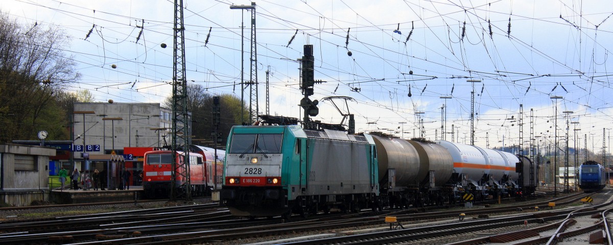 Die Cobra 2828 kommt aus Richtung Köln,Aachen-Hbf mit einem Kurzen gemischten Güterzug aus Köln-Gremberg nach Antwerpen-Noord(B) und fährt in Aachen-West ein und im Hintergrund rangiert die 152 056-8 DB Aufgenommen in Aachen-West bei Sonne und Regenwolken am Nachmittag vom 23.3.2014.