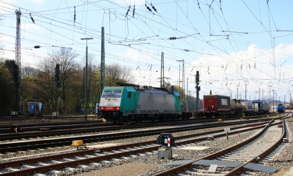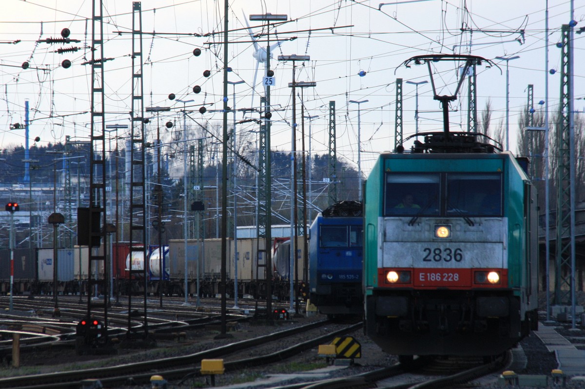 Die Cobra 2830 fährt mit einem langen Containerzug aus Gallarate(I) nach Antwerpen-Oorderen(B) bei der Ausfahrt aus Aachen-West und fährt in Richtung Montzen/Belgien und im Hintergrund  steht eine 185 535-2 von Crossrail und Zwei 185er von Crossrail stehen auf dem Abstellgleis in Aachen-West bei Sonne und Regenwolken am 23.3.2014.