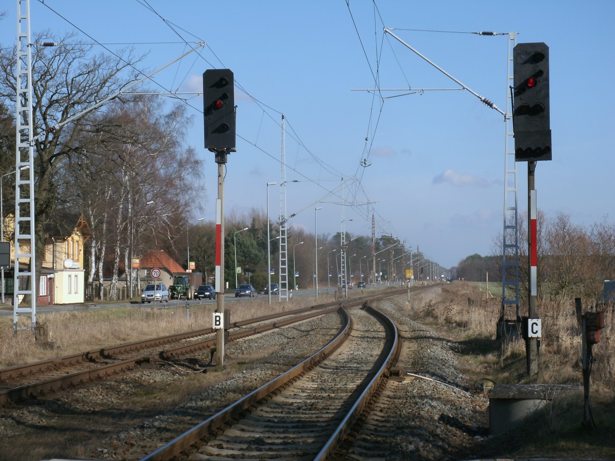 Im Kreuzungsbahnhof Gelbensande(Strecke Rostock-Stralsund) sind die  bei der DR bekannten Lichtsignale in Betrieb.Hier sind es die Ausfahrsignale B und C in Richtung Stralsund die ich am 23.Februar 2014 fotografierte.