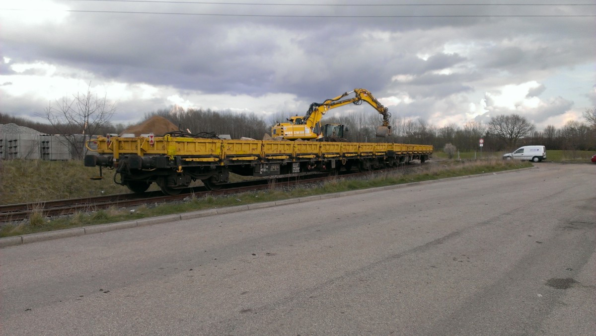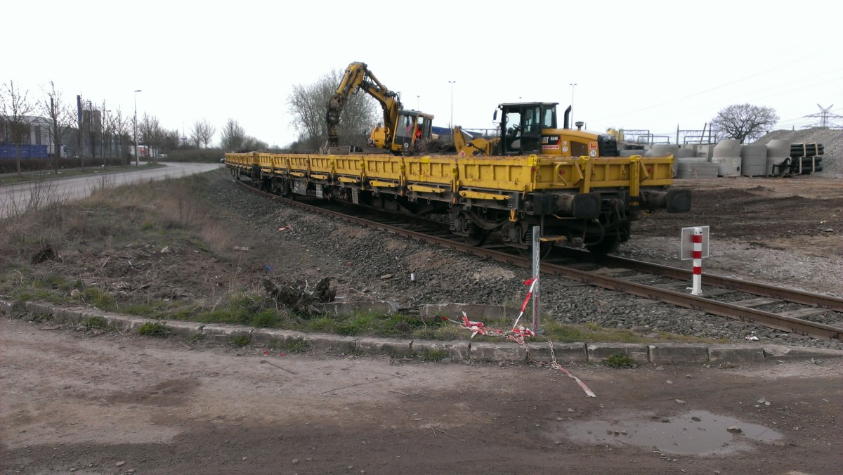 Kiel Wellsee am 25.03.2014; 2 vierachsige Güterwagen werden entladen auf einem selten befahrenem Gleis
