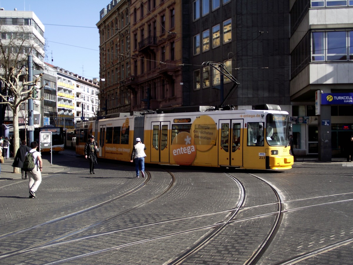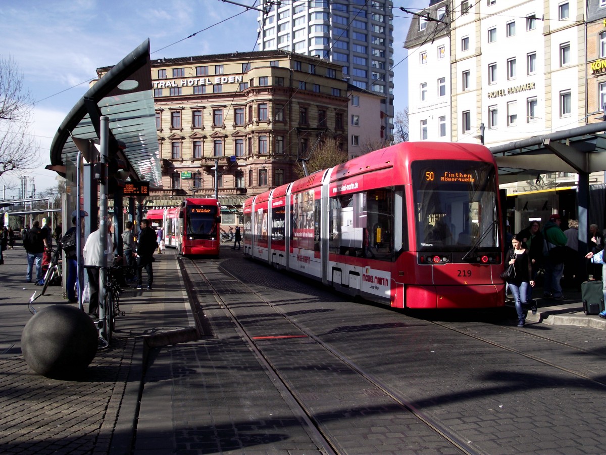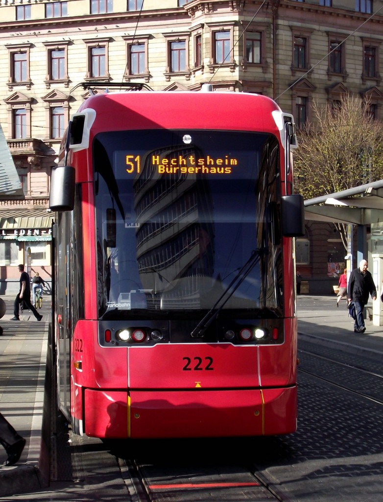 Am 20.03.14 steht in Mainz Hbf der MVG Wagen 222 auf dem Vorplatz