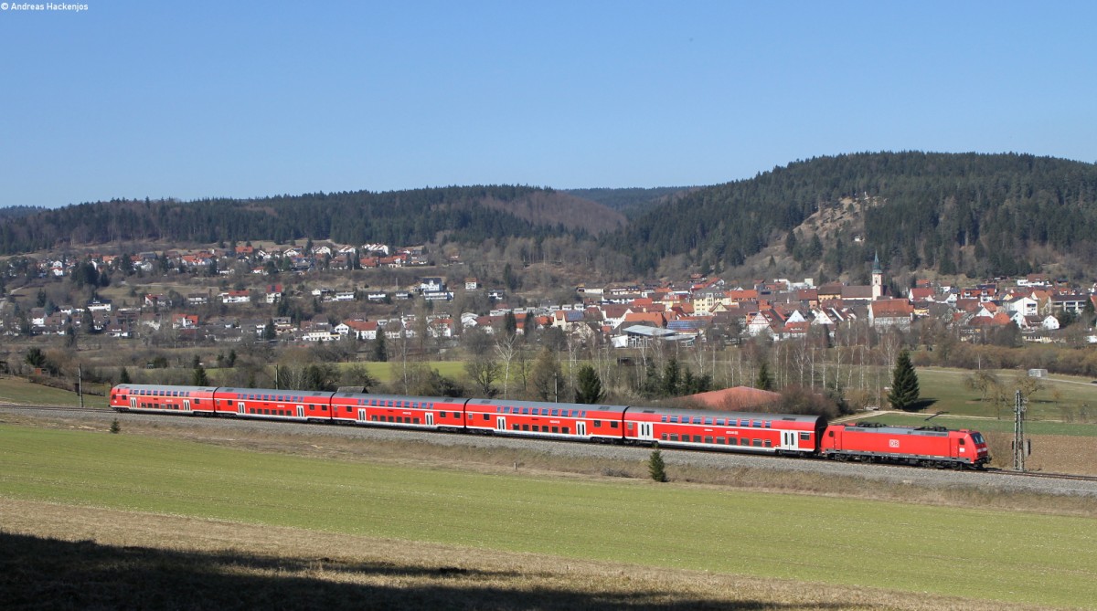 Bergab...aber mit einigen Kurven geht es von Schönberg/Vogtland nach Mehltheuer. 143 359-8 rollt mit ihrem RE von Hof nach Dresden auf uns zu. Gleich unterquert der Zug die Elmbrücke, die schon vor der Elektrifizierung neu und in der entsprechenden Höhe errichtet worden ist. Dann wird der RE den BÜ bei Drochaus passieren und dann in ein Wäldchen vor Mehltheuer einfahren. Bahnstrecke 6362 Leipzig (Bayerischer Bahnhof) - Hof am 14.03.2014