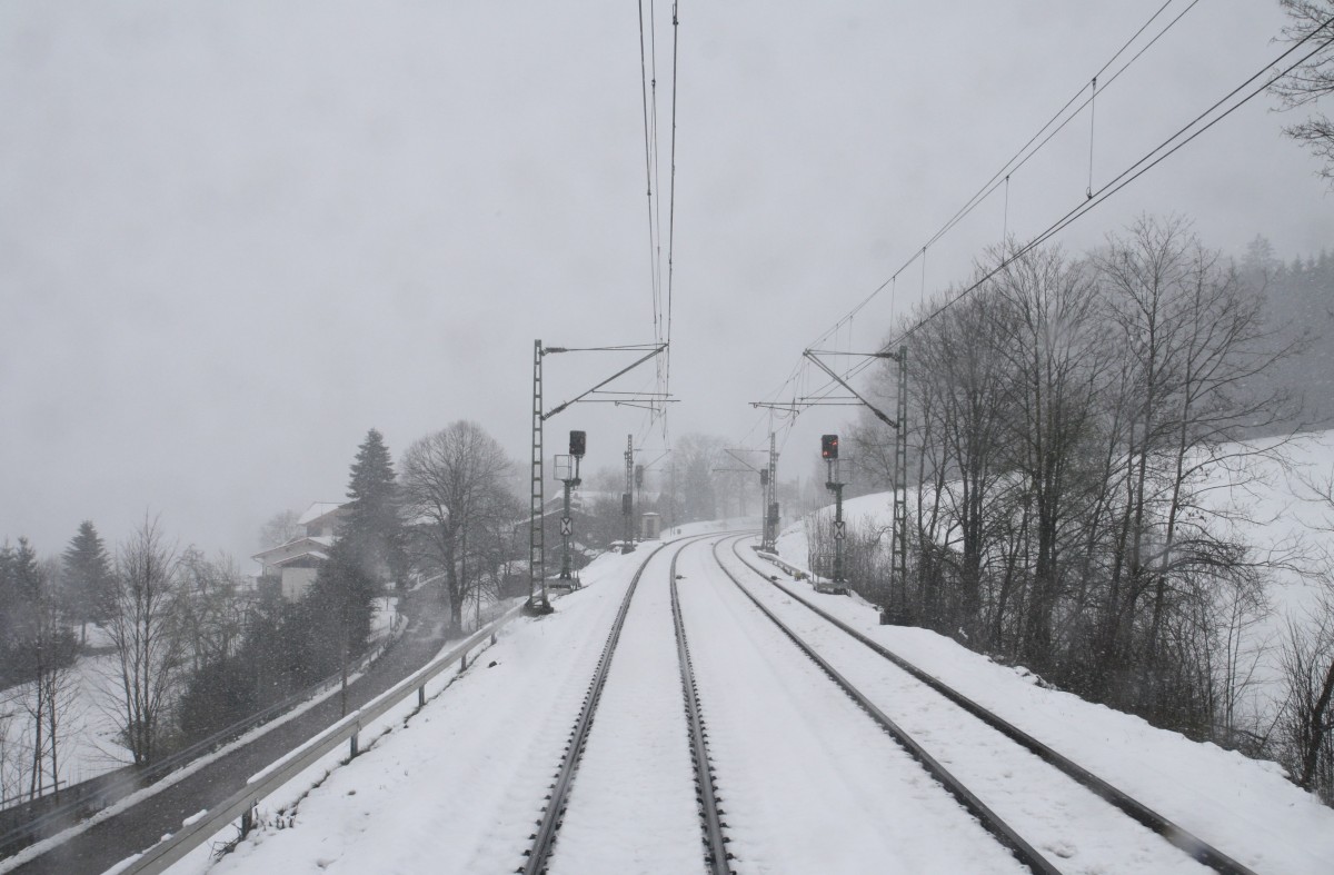 Starkes Schneetreiben im Frühling. Hier fotografiert am 24.3.2014 auf der Strecke Rosenheim-Salzburg aus dem IC 865 Bregenz-Wien West bei Bergen(Oberbayern). Der Schnee war nicht lange da, ein paar Kilometer weiter war wieder alles grün.