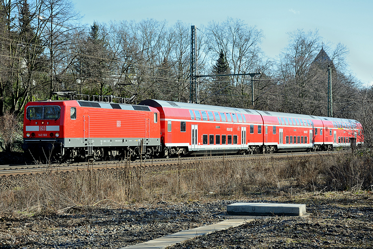 143 009 schiebt RB27 in Richtung Koblenz, hier bei Bonn-Beuel 12.02.2014