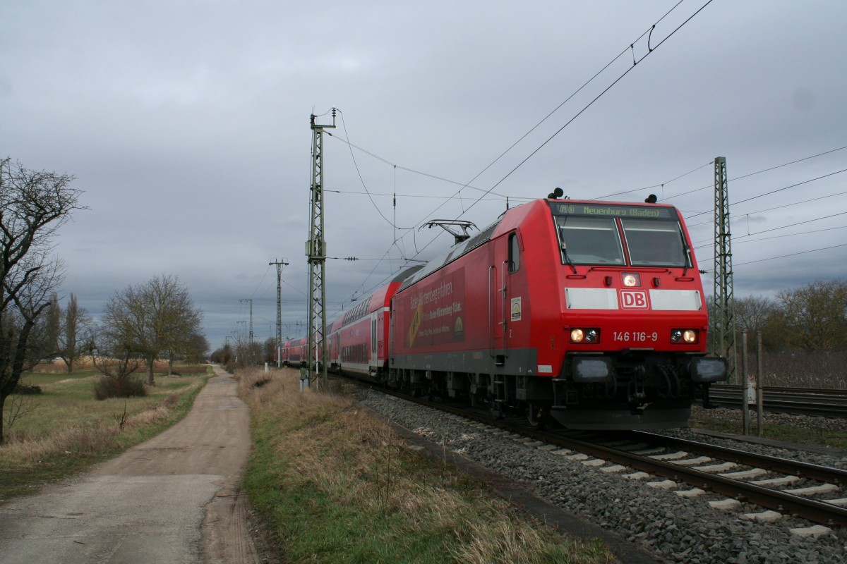 146 116-9 brachte am Nachmittag des 14.02.14 eine RB von Offenburg nach Neuenburg (Baden). Hier konnte ich die Garnitur bei der Einfahrt in Müllheim (Baden) auf Gleis 14 festhalten.
