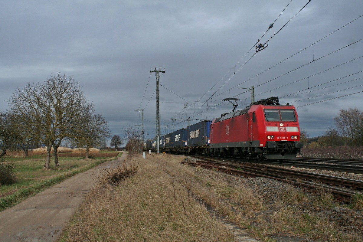 185 152-2 mit einem Containerzug gen Süden am Nachmittag des 14.02.14 bei der Durchfahrt im Bahnhof Müllheim (Baden).