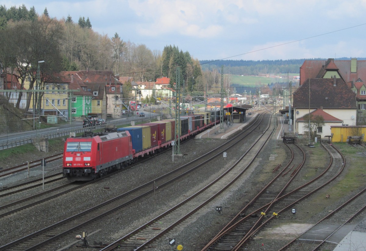 185 370-4 zieht am 26. März 2014 einen Containerzug durch Kronach in Richtung Lichtenfels.