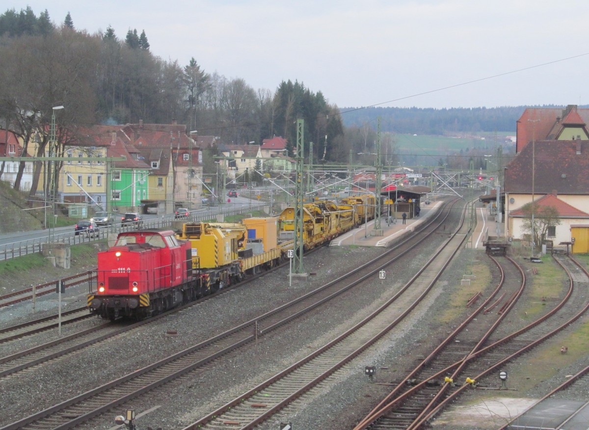 203 111-0 von EBM Cargo zieht am 27. März 2014 einen Bauzug durch Kronach in Richtung Lichtenfels.