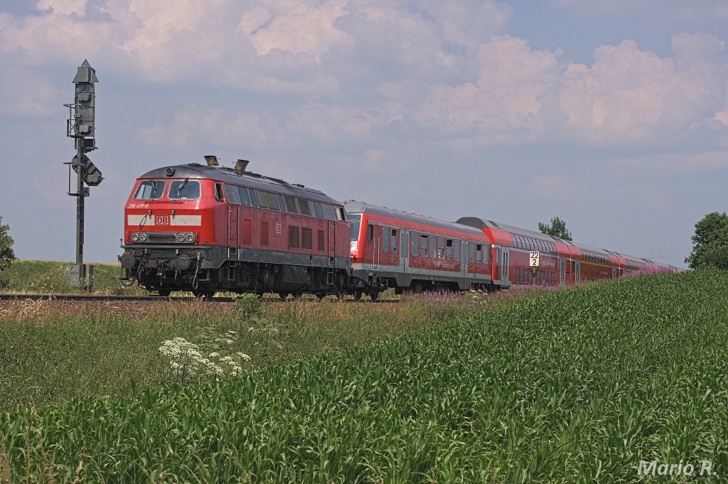 218 419 schiebt am Ende des Sandwiches der RB nach Mühldorf am 19.7.13. Das ganze kurz nach Markt Schwaben aufgenommen.