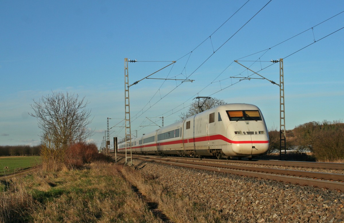402 032-7 und 402 016-0 waren am 11.02.14 als Ersatz-ICE 279 von Berlin Ostbahnhof nach Basel SBB gefahren und übernahmen anschließend die Rückleistung als ICE 274 zurück in Richtung Landeshauptstadt. Hier konnte ich den Zug auf dem Rückweg bei Hügelheim festhalten.