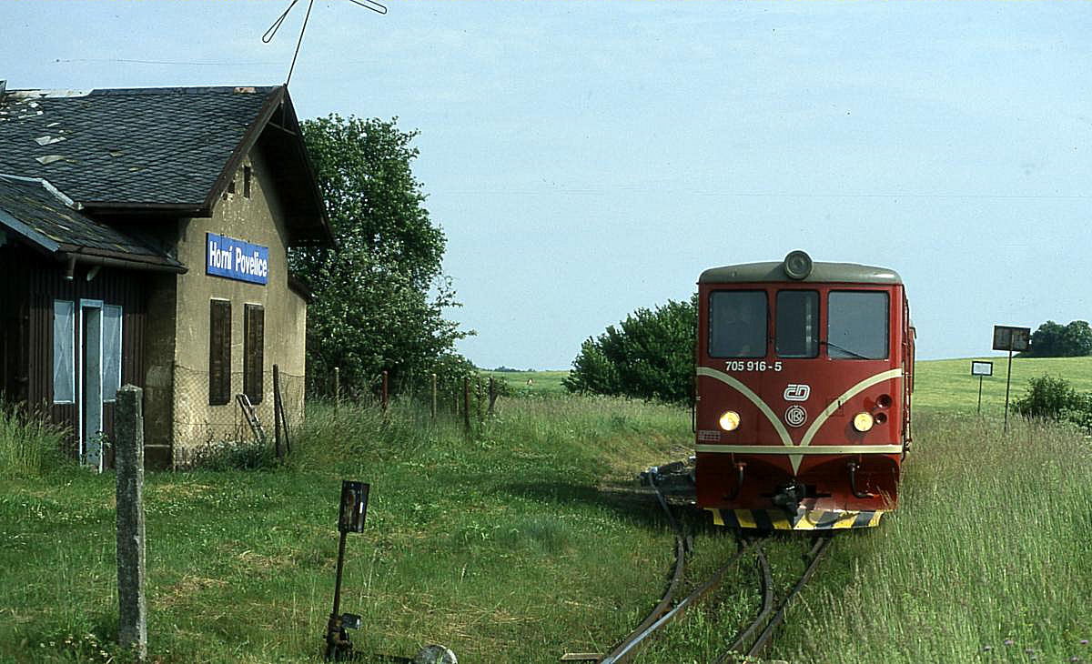 Am 16.6.2001 hält 705916 mit dem Zug nach Osoblaha kurz im kleinen Landbahnhof Horni Povelice.
