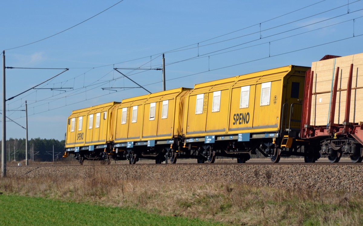 Am Zugschluss des von 185 004 geführten Güterzuges lief am 20.03.14 diese Wagen-Einheit von Speno mit.