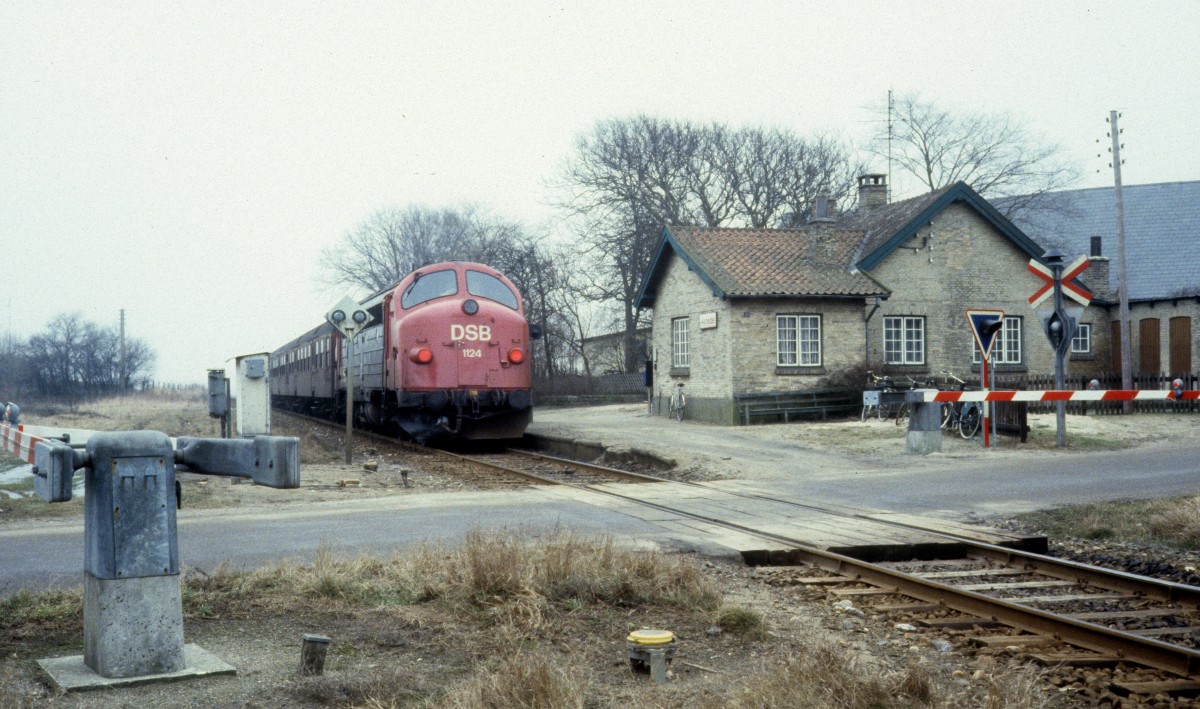 DSB: Die DSB-Diesellok My 1124 hält am 16. Februar 1982 am Haltepunkt Avnede auf der Insel Lolland. - Der Haltepunkt liegt auf der Bahnstrecke Nakskov - Maribo - Sakskøbing - Nykøbing Falster, die damals von den Zügen der LJ, Lollandsbanen, bedient wurde; einige Fahrten wurden jedoch von DSB-Zügen durchgeführt. - Heute bedienen Züge des Unternehmens Regionstog dieselbe Strecke.