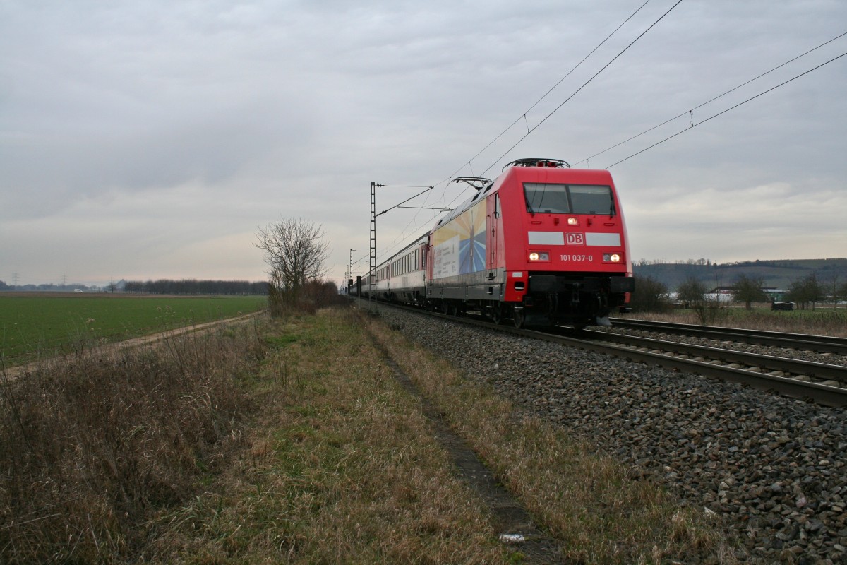 101 037-0 mit dem EC 9 von Hamburg-Altona nach Zürich HB am Nachmittag des 29.01.14 nördlich von Hügelheim.