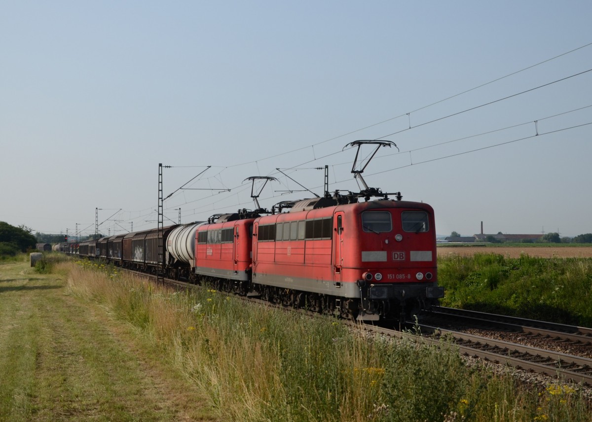 151 085 + 151 017 mit einem Güterzug am 14.07.2013 bei Plattling.