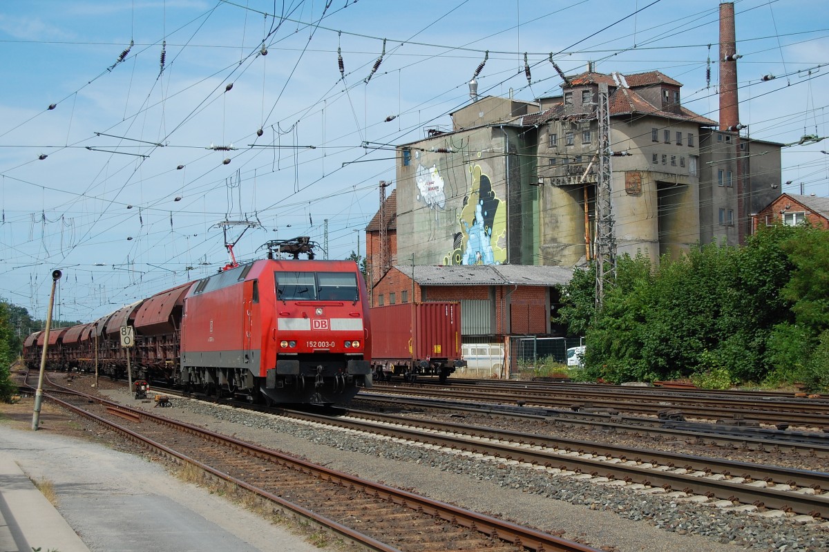 152 003-0 beschleunigt mit einem Tads-Zug aus der Überholung in Verden(Aller), wo der Zug den ICE 79 vorbeigelassen hat.