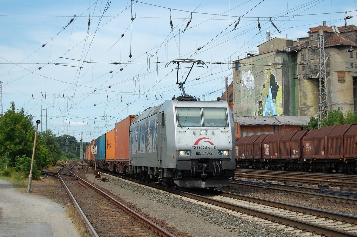 185 540-2 (TXL, Kassel Huskies) mit einem Containerzug am 17.07.2013 in Verden(Aller)