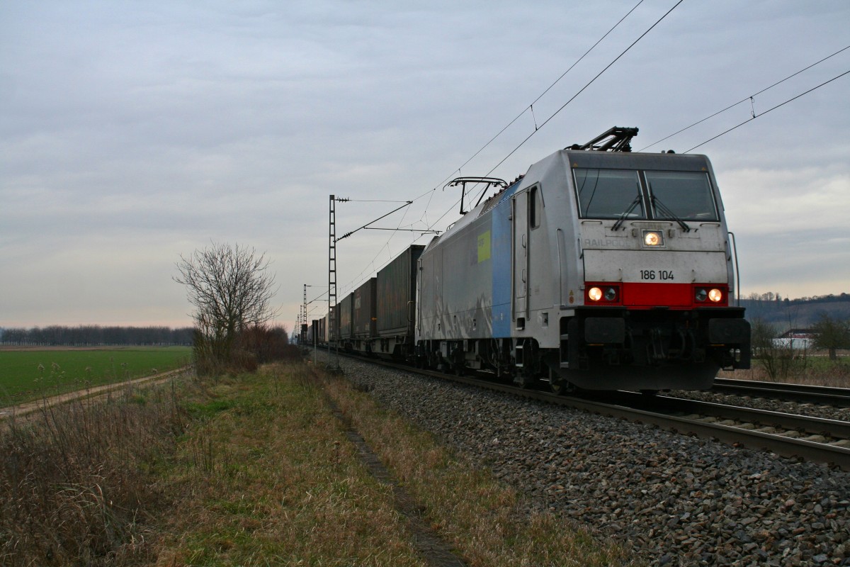 186 104 mit dem 42013 von Wanne-Eickel nach Melzo am Nachmittag des 29.01.14 bei Hügelheim.