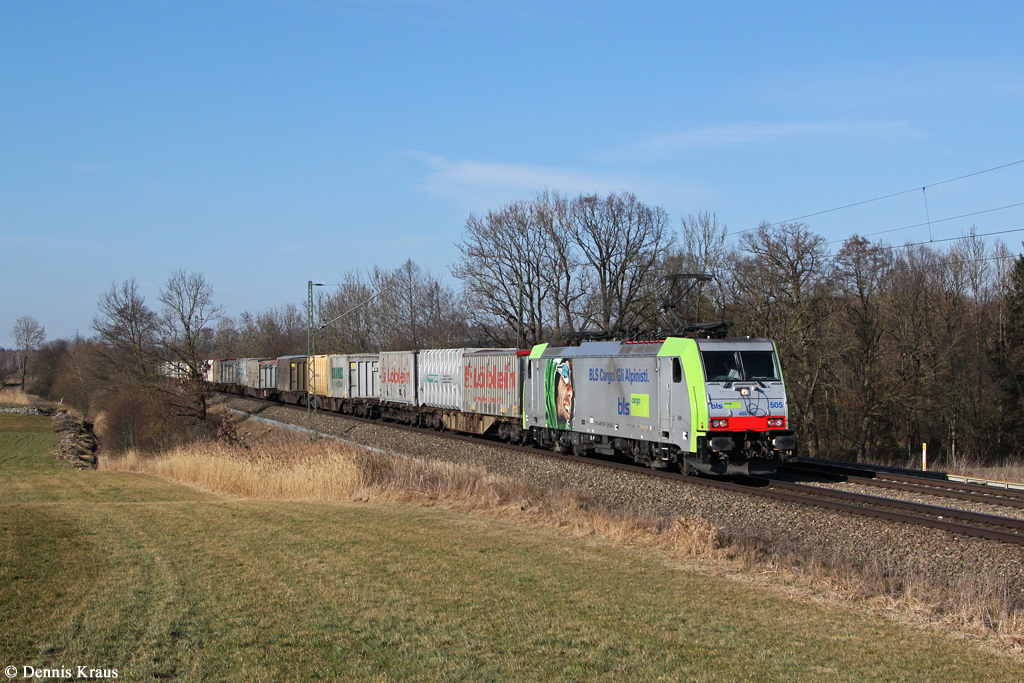 486 505 im Einsatz für Lokomotion mit einem KLV Zug am 28.02.2014 bei Hilperting.