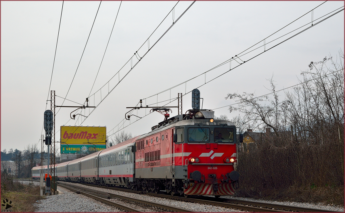 SŽ 343-025 zieht EC158 'Croatia' durch Maribor-Tabor Richtung Wien. /3.3.2014