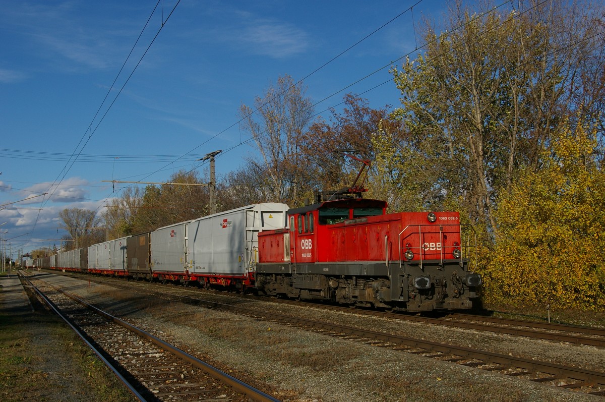 1063 032 fährt am 7.November 2013 mit Zug 47682 von Wien Zentralverschiebebahnhof nach Wr. Neustadt durch den Bahnhof Münchendorf.