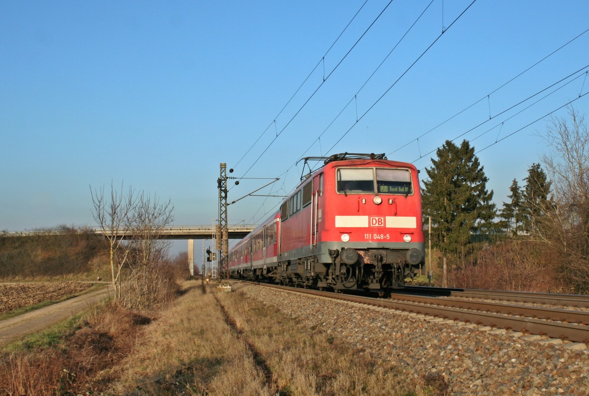 111 048-5 mit einer RB von Offenburg nach Basel Bad. Bf am Nachmittag des 31.01.14 bei Hügelheim.