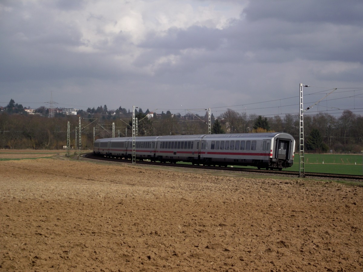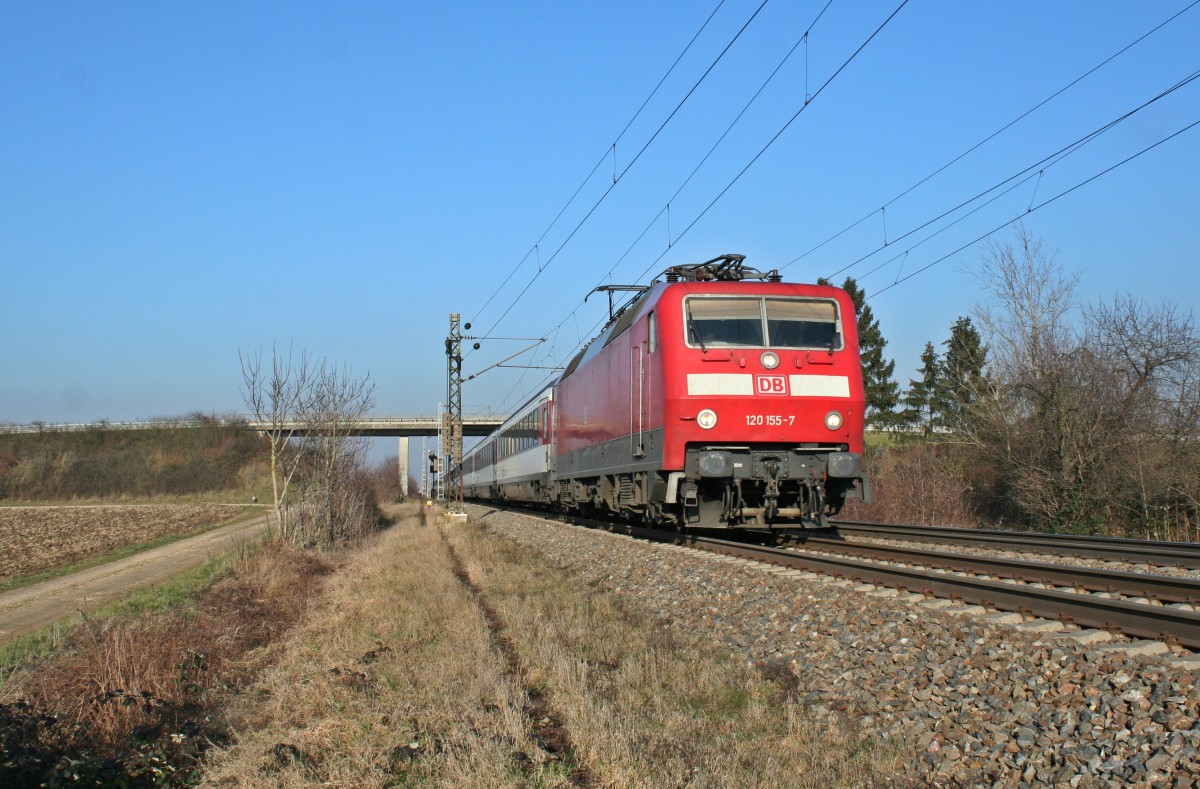 120 155-7 mit dem EC 9 auf der Weg von Hamburg-Altona nach Zürich HB am Nachmittag des 31.01.14 bei Hügelheim.