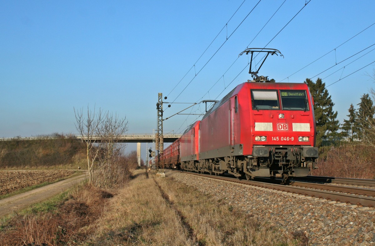 145 046-9 und 145 069-1 brachten am 31.01.14 einen außerplanmäßigen Müllzug an die Schweizer Grenze. Hier konnte ich das äußert selten zu sehende Gespann bei Hügelheim ablichten.