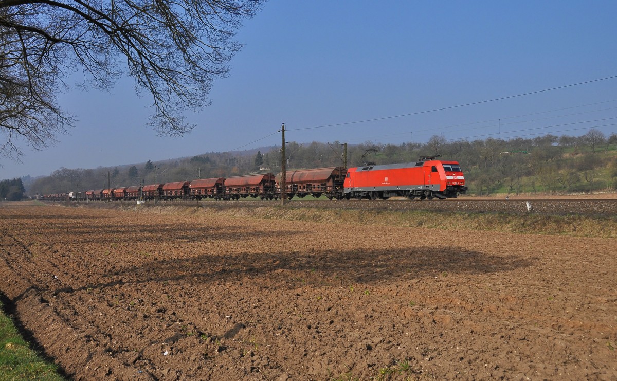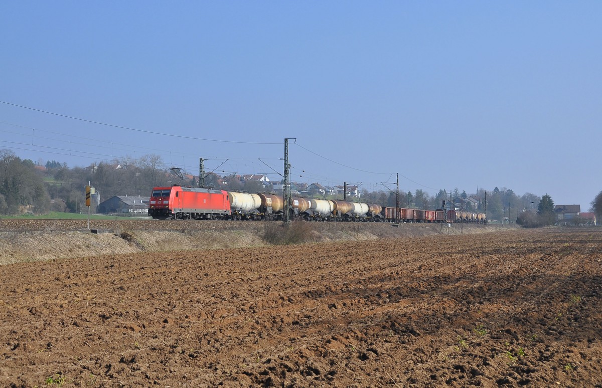 185 390 mit einem Mischer auf der KBS 750 Richtung Kornwestheim.Aufgenommen bei Ebersach an der Fils am 8.3.2014.