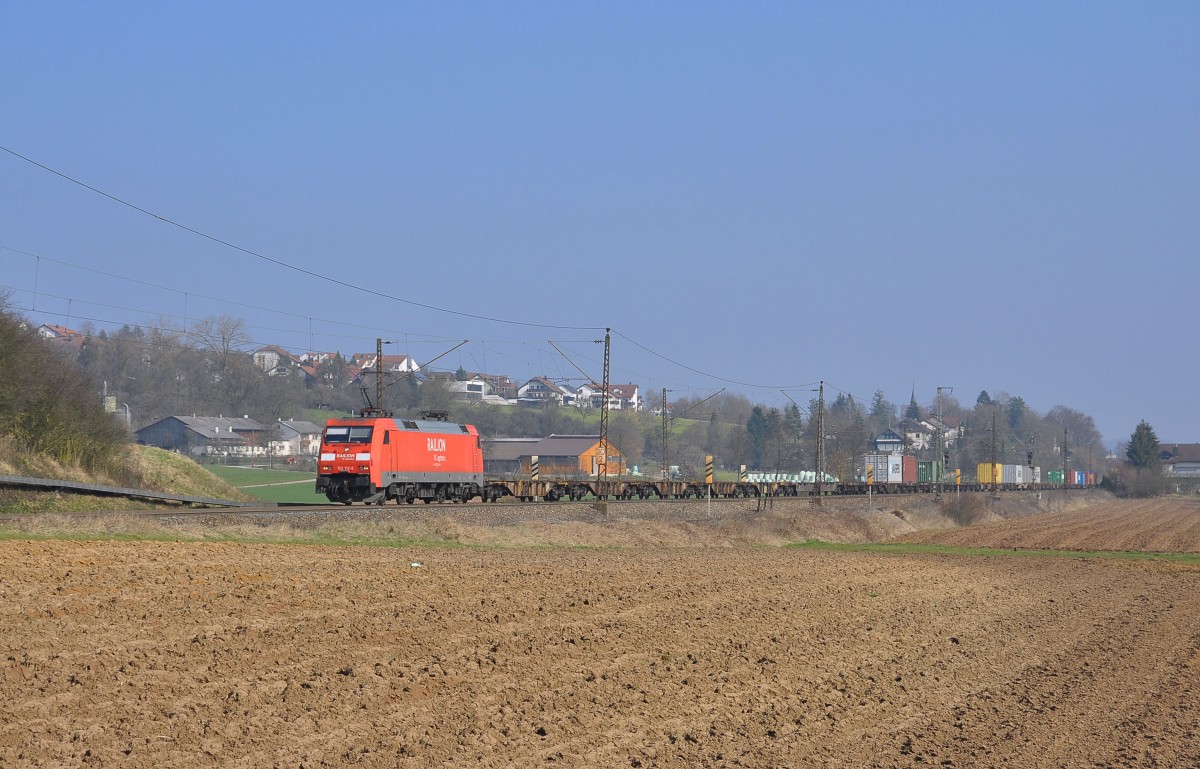 152 112 mit Containern auf der KBS 750 der Filstalbahn in Richtung Kornwestheim.Aufgenommen bei Ebersbach an der Fils am 8.3.2014.