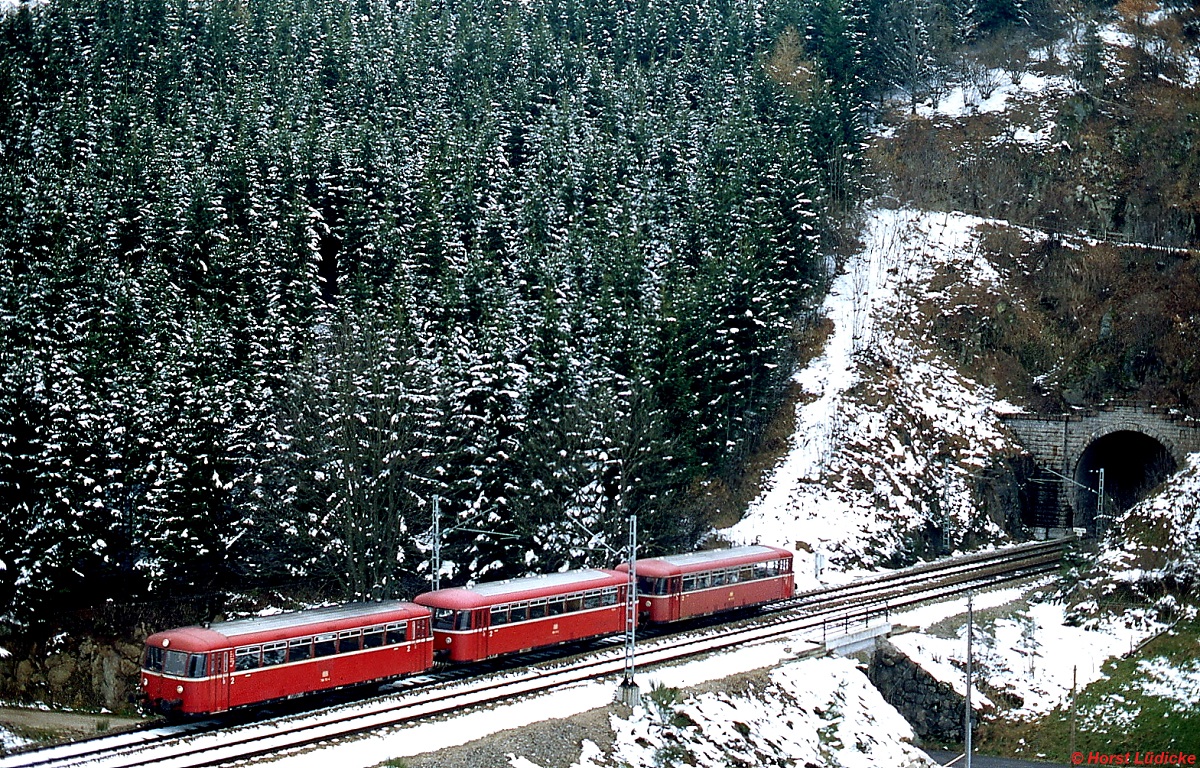 An einem Apriltag Anfang der 1980er Jahre ist eine 798/998-Garnitur auf der Schwarzwaldbahn bei Triberg unterwegs. Über Nacht ist noch einmal etwas Neuschnee gefallen.