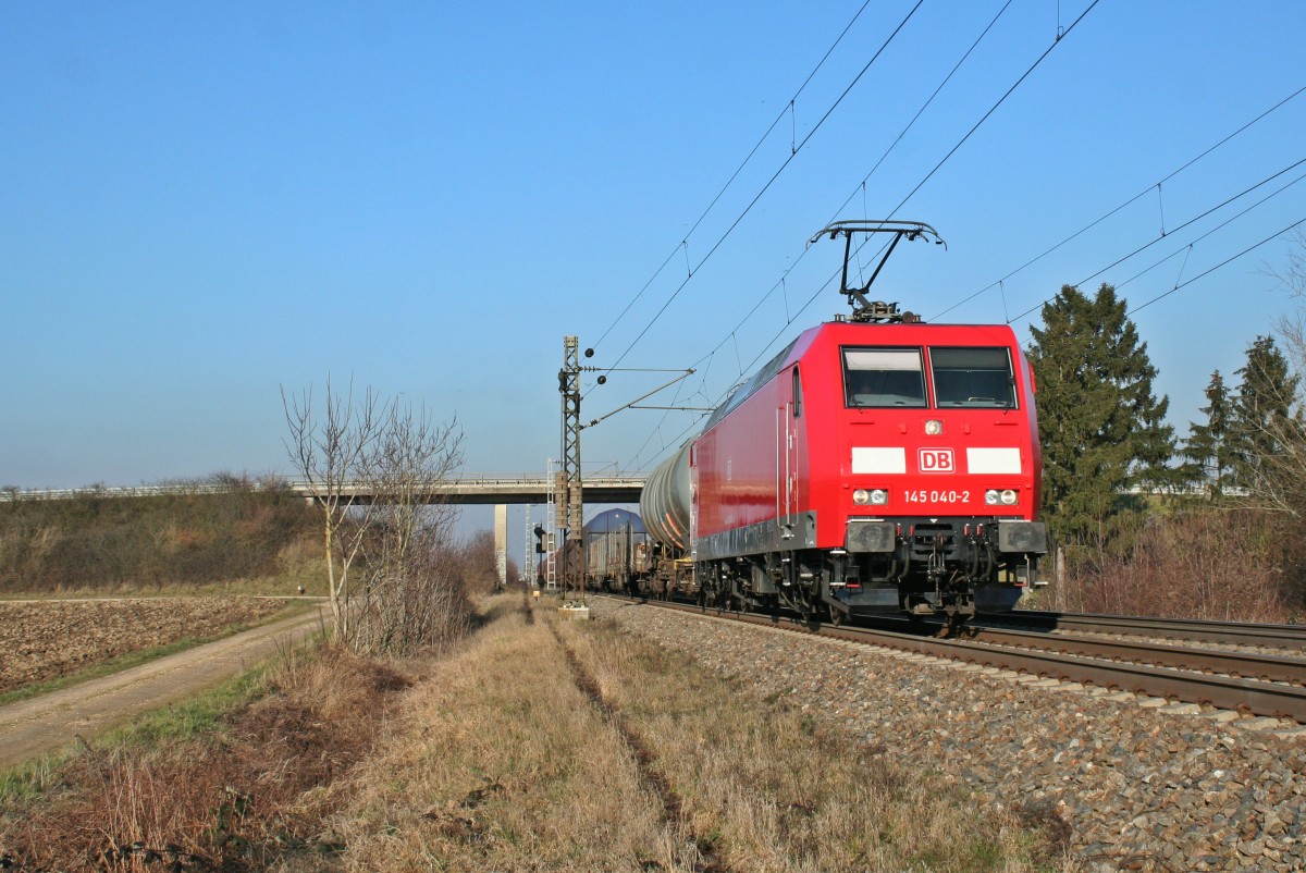 Die frisch lackierte 145 040-2 brachte am 31.01.14 einen gemischten Güterzug nach Basel. Hier konnte ich sie am Nachmittag bei Hügelheim aufnehmen.