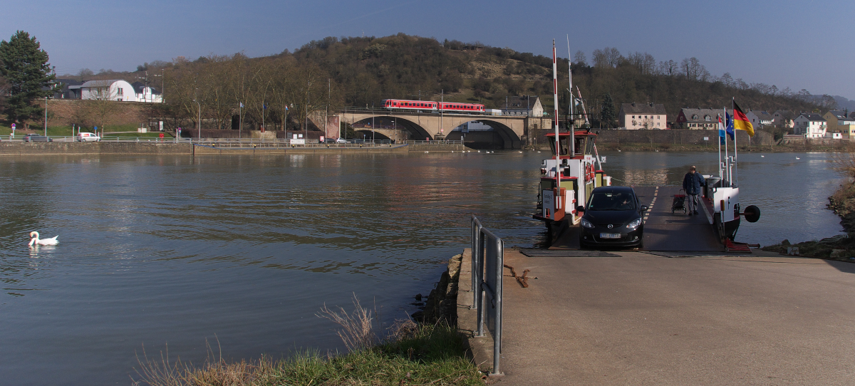 Zur Freude der Fotografen fuhr beim Warten auf die Fähre der leicht verspätete RE 5211 Luxembourg – Trier Hbf über die Sauerbrücke in Wasserbillig und konnte zusammen mit dem Schiff abgelichtet werden. 07.03.2014 (Jeanny)