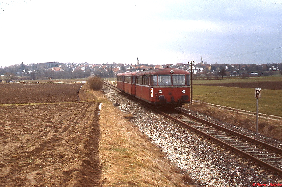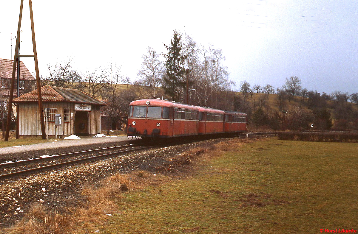 Im Februar 1986 fährt eine 798/998-Garnitur auf dem Weg von Göppingen nach Bad Boll in Göppingen-St. Gotthardt ein. Diese Bahnlinie wurde erst 1926 eröffnet und schon 1989 für den Personenverkehr stillgelegt. Es gibt aber Bemühungen, die Strecke zu reaktivieren.