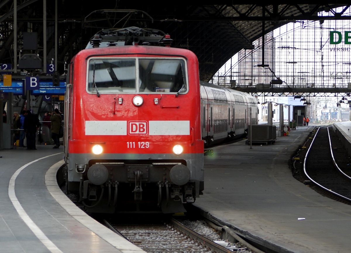 Regionalzug mit Lokomotive der Baureihe 111 im Kölner Hauptbahnhof. 13.1.2014