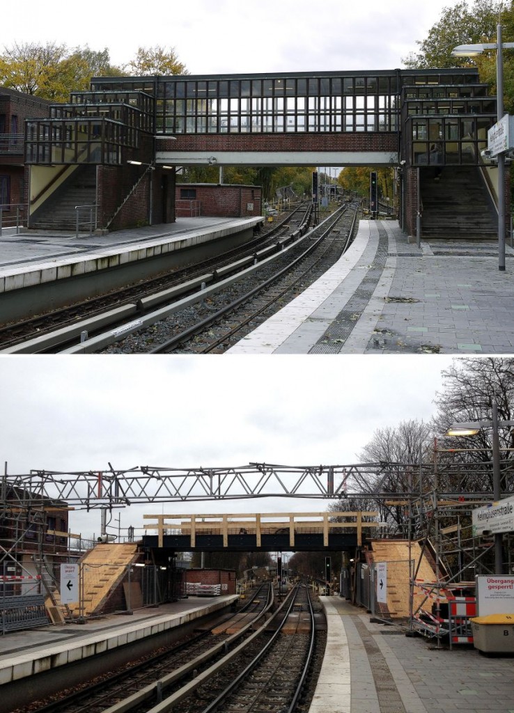 Rekonstruktion: der Übergang zwischen den beiden Bahnsteigen der Hamburger U-Bahnstation "Kellinghusenstraße" - ein Architekturjuwel der 20er Jahre - wird von der HHA gerade originalgetreu rekonstruiert. Oben vor und unten während der Sanierung im Frühjahr 2014.