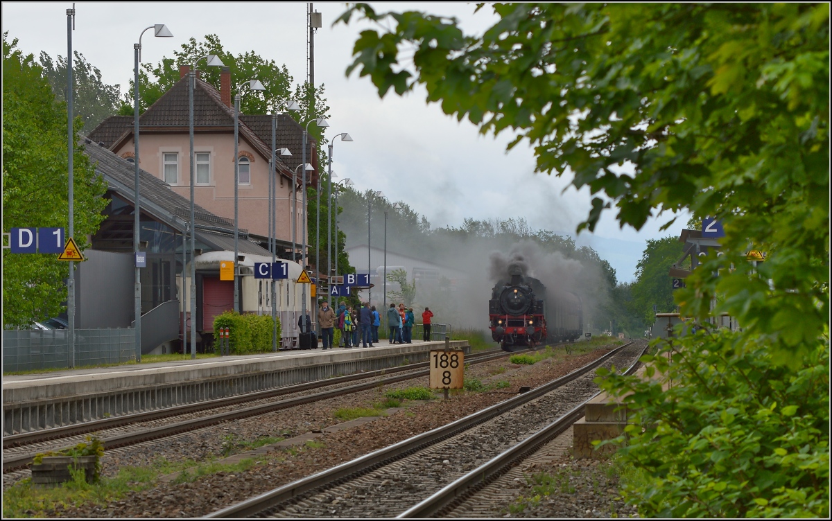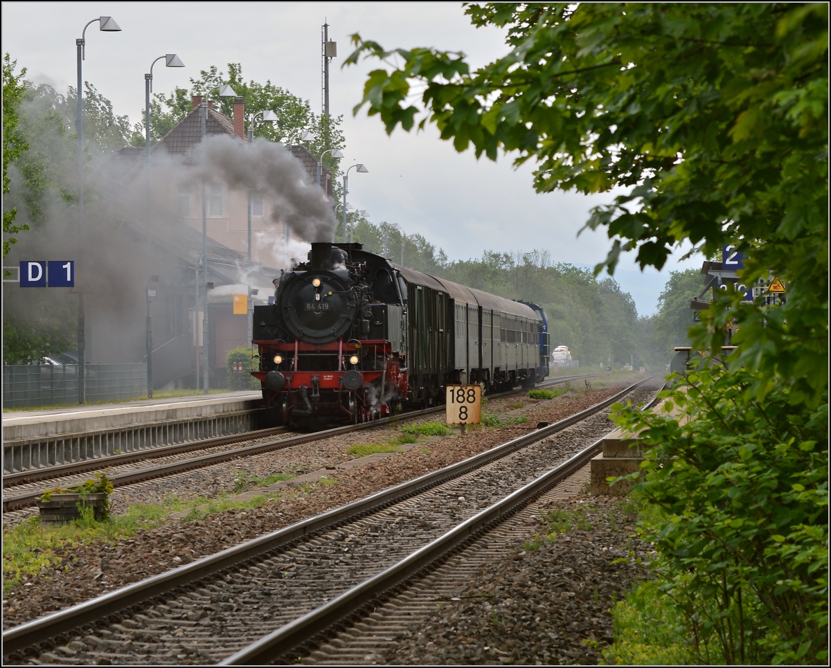 Was wäre die schwäbische Eisenbahn ohne Meckenbeuren. 64 419 erreicht mit ihrem Sonderzug Meckenbeuren. Mai 2014.